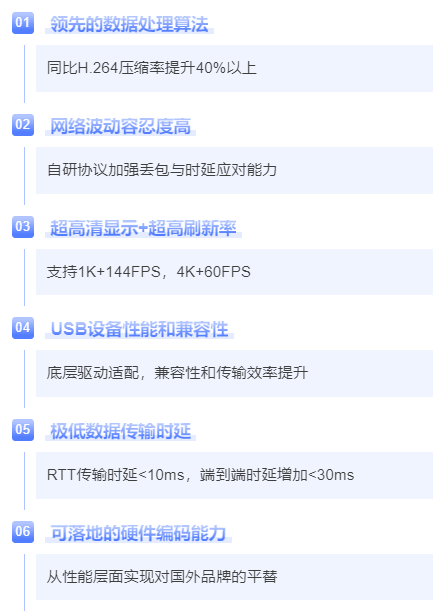 该解决方案在图像编解码、协议传输、USB性能方面投入大量研发资源,使 OCloud View 获得了六大桌面云产品技术优势: