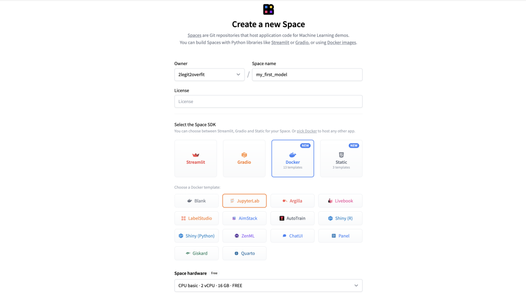 给你的 Space 起个名字 选择 Docker > JupyterLab
