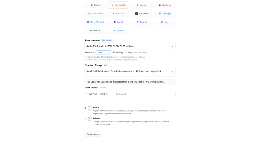 设为Nvidia A10G Small其余都保留为默认值 点击 Create Space