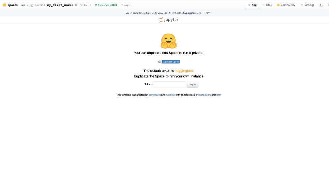 新建好空间后,你会看到登录页。如果你在模板中把令牌保留为默认值,则可以填入 “huggingface” 以登录。否则,只需使用你设置的令牌即可。