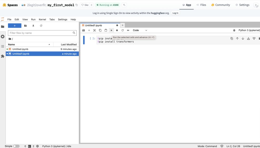 在新 notebook 中,安装 PyTorch 和 transformers 库,因为其并未预装在环境中。