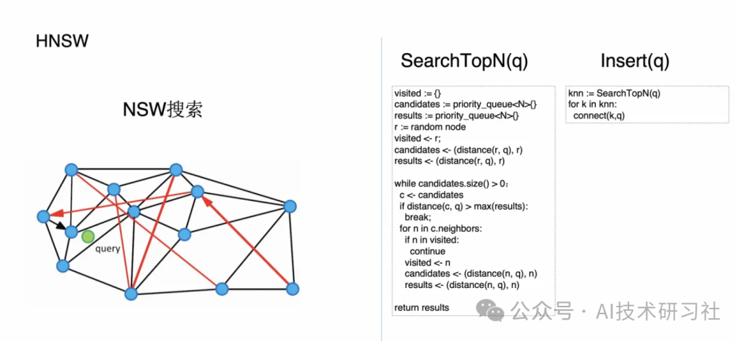 HNSW 本质上是在 NSW 上做一个阶层的叠加,它本质上其实就是一个类似于 skip list 的数据结构,它能通过上面的那些层去加速进到离查询节点最近的那个点的步骤。