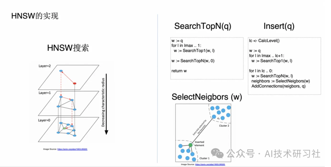 这种情况下本质上我相当于是先掷一个硬币,由这个硬币的结果来决定要插入到最高的是哪一层。具体插入的时候,对于上面从最顶层到要插入的这一层的上面一层,算法仍然是一样的,就是找到离它最近的节点,然后从要插入这一层到最底层开始,对于每一层我都会去找它的这个离它最近的 top n 个,那这里跟前面的 NSW 算法不同的是我们多加了称之为 SelectNeighbors 的这个函数。