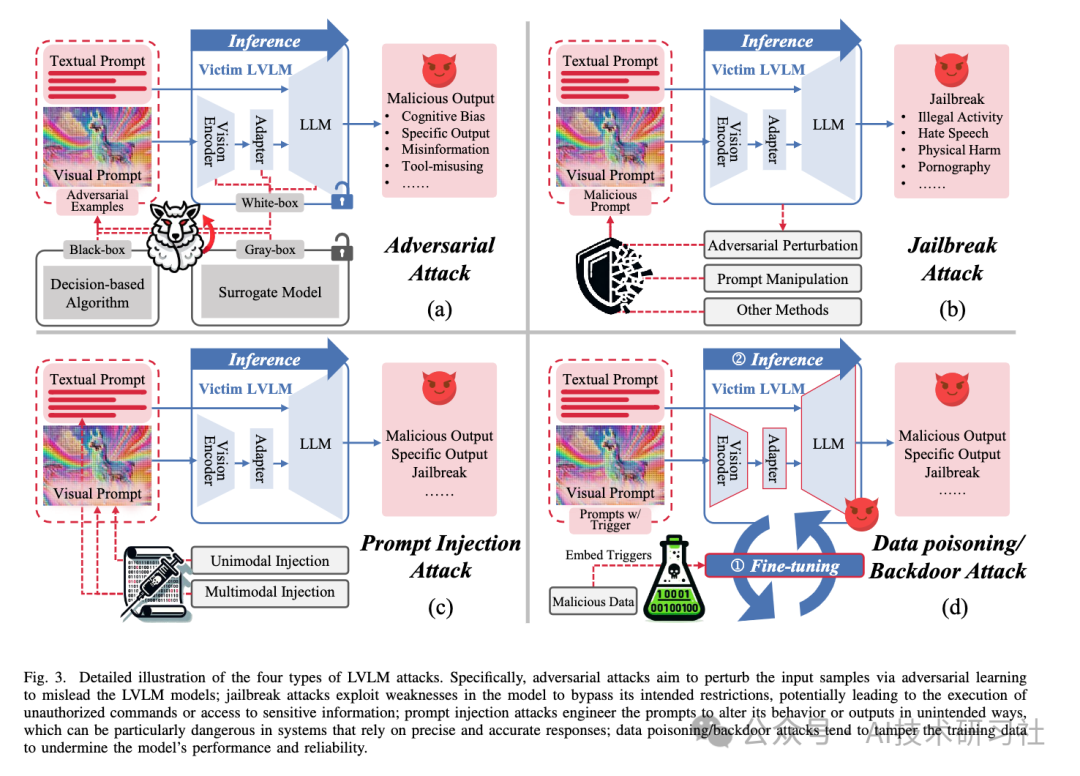 然后,系统梳理了LVLM攻击方法的发展历程,如操纵模型输出的对抗性攻击、利用模型漏洞进行非法操作的越狱攻击、设计提示类型和模式的提示注入攻击、影响模型训练的数据中毒等。