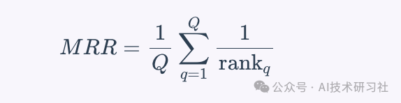 平均倒数排名(MRR)是一种评估检索系统效果的度量指标,它考虑了第一个相关文档的排名位置。当只有第一个相关文档是主要关注的情况下,MRR特别有用。倒数排名是第一个相关文档被找到的排名的倒数。MRR是多个查询的这些倒数排名的平均值。MRR的公式如下:
