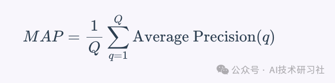 平均准确率(MAP)是一种评估多个查询的检索精确度的度量指标。它同时考虑了检索的精确度和检索文档的顺序。MAP定义为一组查询的平均准确率得分的平均值。为了计算单个查询的平均准确率,需要在检索到的文档的排序列表中的每个位置计算精确度,只考虑前K个检索到的文档,其中每个精确度都根据文档是否相关进行加权。多个查询的MAP公式如下: