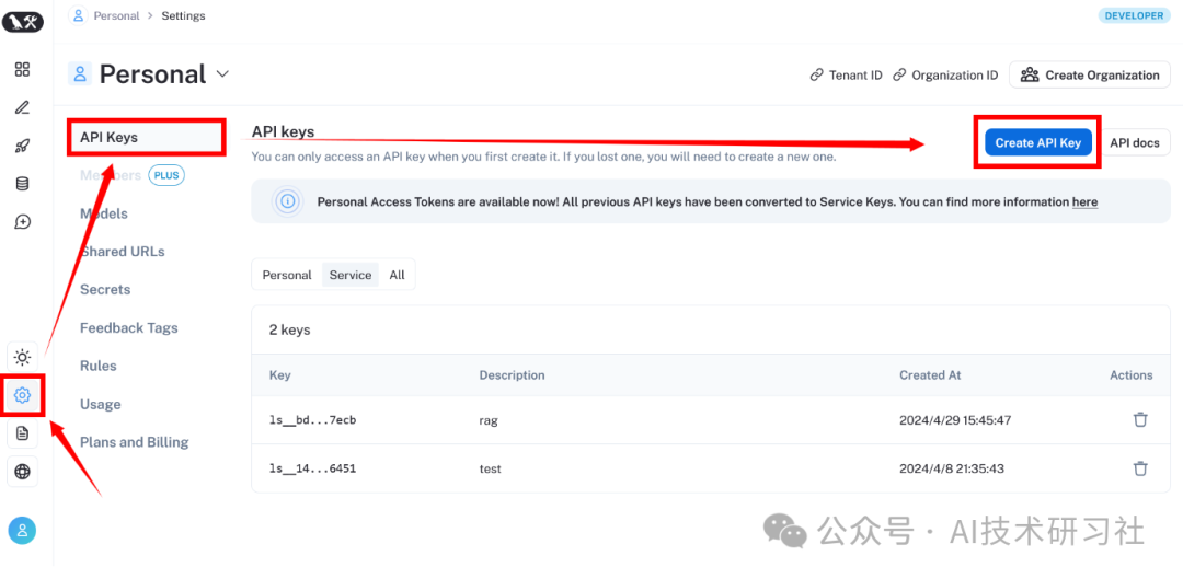 第一步:获取一个LangChain的API Key,登录LangSmith:https://smith.langchain.com/,参考下图创建API key: