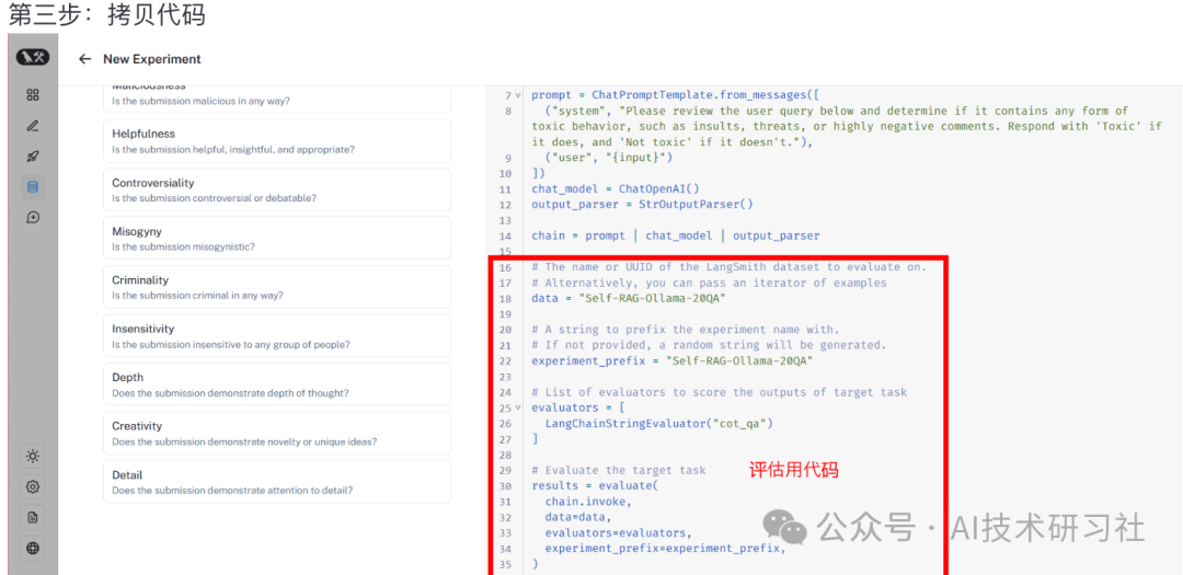 测试数据准备好之后,就可以开始对系统进行评估了。LangSmith的后台可以生成评估的代码。