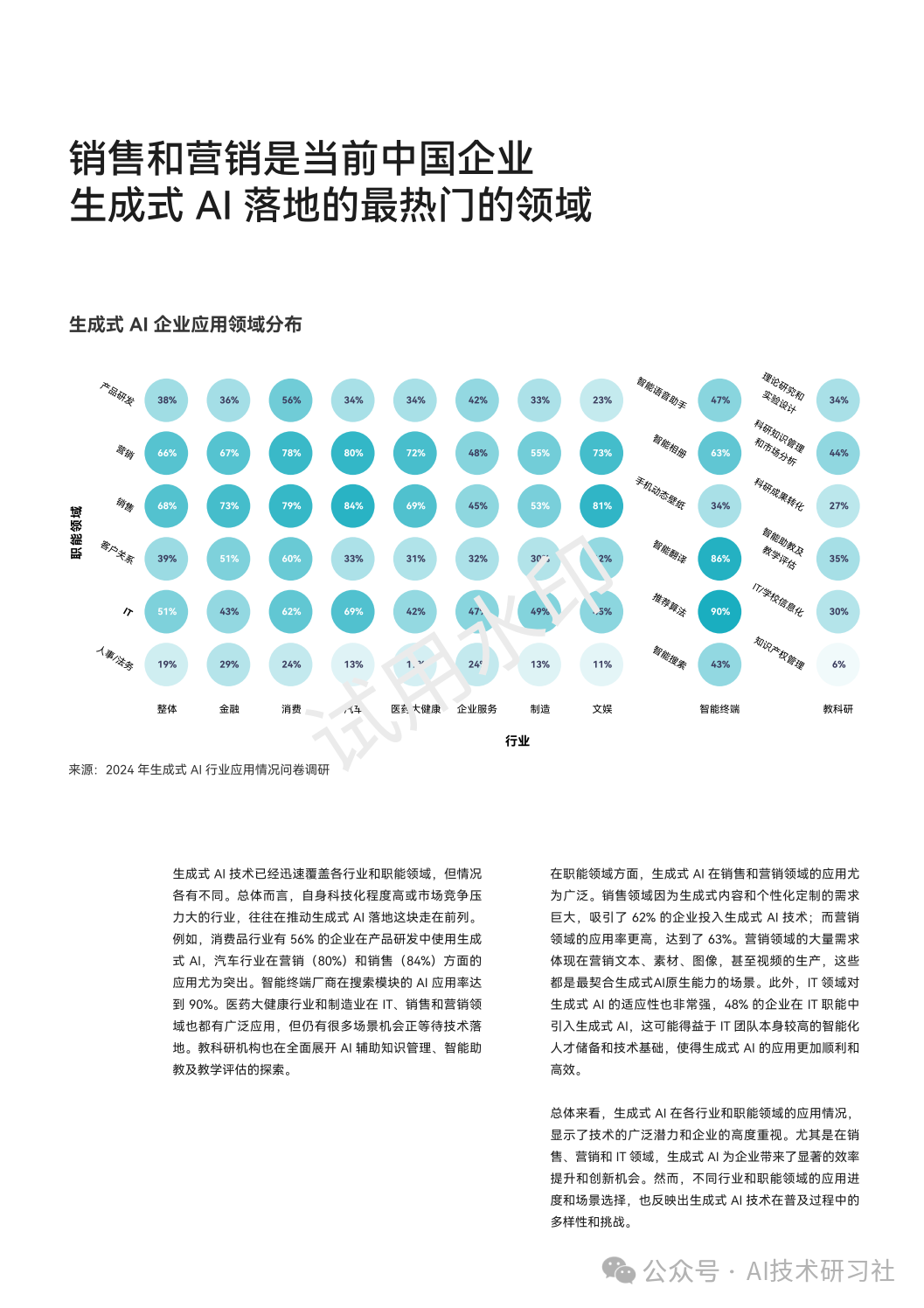生成式AI技术已经迅速覆盖各行业和职能领域,但情况各有不同。总体而言,自身科技化程度高或市场竞争压力大的行业,往往在推动生成式AI落地这块走在前列。例如,消费品行业有56%的企业在产品研发中使用生成式AI,汽车行业在营销(80%)和销售(84%)方面的应用尤为突出。智能终端厂商在搜索模块的AI应用率达到90%。医药大健康行业和制造业在IT、销售和营销领域也都有广泛应用,但仍有很多场景机会正等待技术落地。教科研机构也在全面展开AI辅助知识管理、智能助教及教学评估的探索。