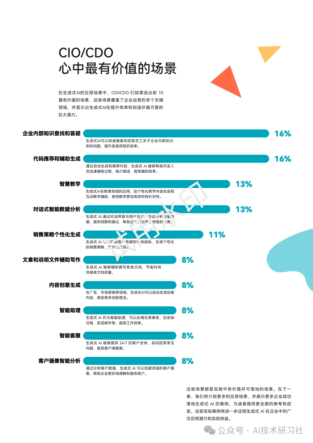 在生成式AI的应用场景中,CIO/CDO 们投票选出前10最有价值的场景,这些场景覆盖了企业运营的多个关键领域,并显示出生成式AI在提升效率和创造价值方面的巨大潜力。