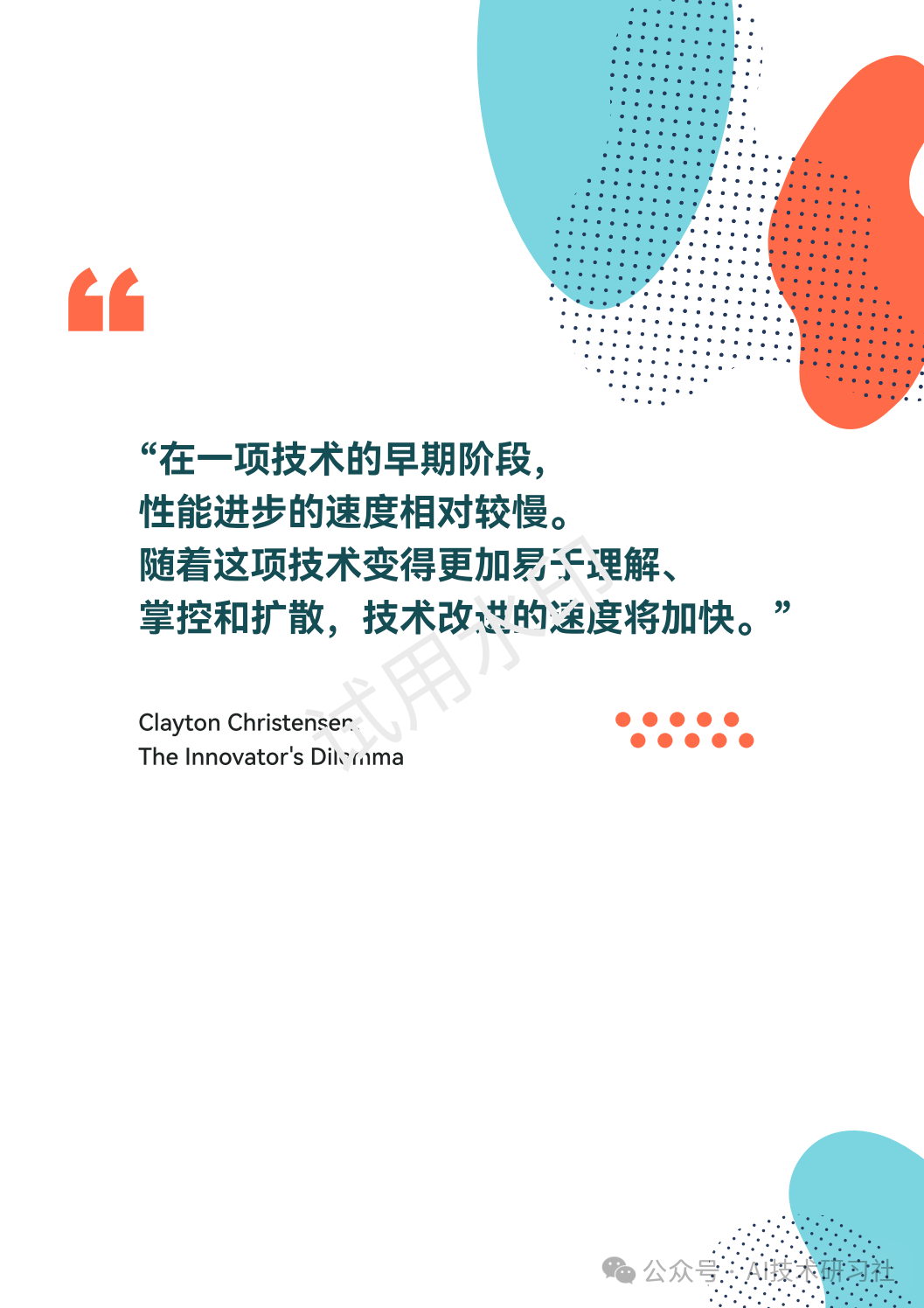 最后,当AI技术变得无处不在、无所不能时,它将像互联网一样,成为数字社会不可或缺的底层操作系统,与商业浑然一体,进入“无形”的阶段。在这个阶段,AI将深度融入商业和社会的方方面面,成为支撑一切活动的基础设施。人们可能已经习惯了AI的存在,不再把它看作一种独立的技术,而是将其视为理所当然的工具和助手。到那时,商业模式将以AI为基础,但AI本身不再带来创新红利。就像今天的互联网,它已经渗透到每个角落,但人们关注的是由它支撑的各种应用和服务,而不是互联网技术本身。