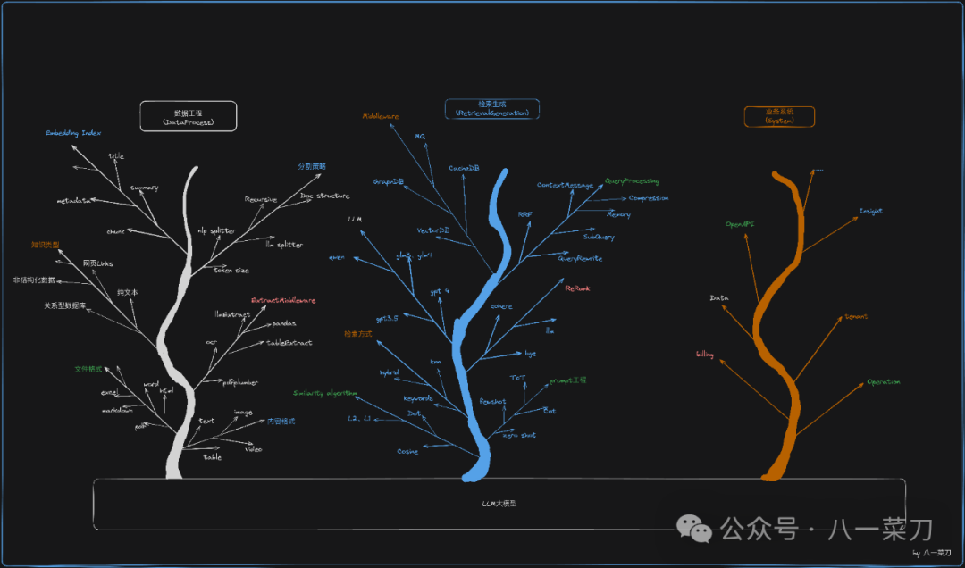 这里面我为做RAG系统的总结为三颗树,LLM大模型是土壤,主要为:数据工程、检索生成、业务系统