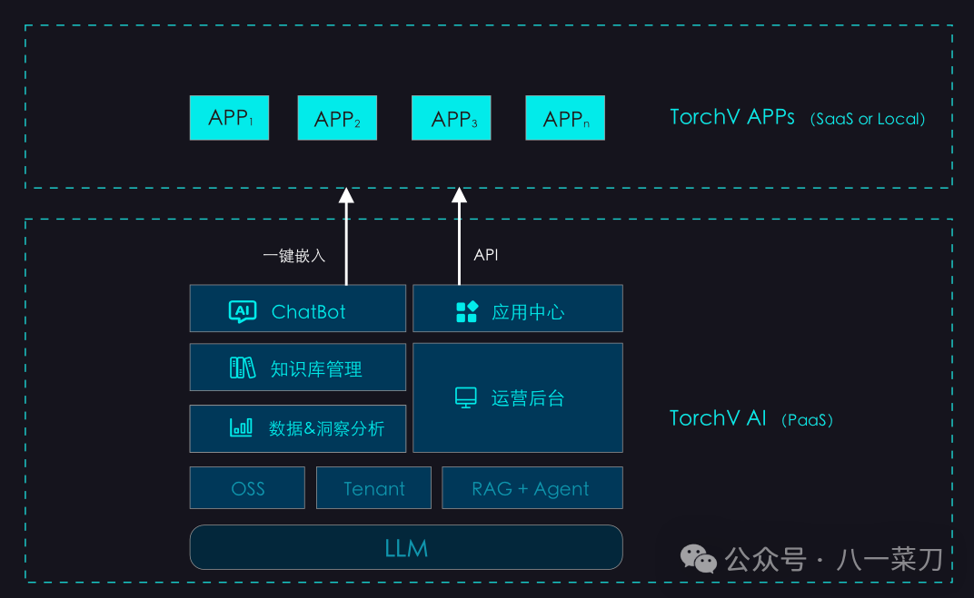 RAG和Agent:RAG(检索增强生成)和Agent是目前大语言模型落地到企业应用的事实标准,也是TorchV AI的核心中间件之一; Tenant:租户系统,这是我们支起多租户PaaS/SaaS平台的基础; OSS:在线文件存储,包括客户上传的文件,以及从URL中导入的数据等; ChatBot:TorchV AI会提供一个默认的Web版问答系统,客户可以在上面对知识进行测试,对于内部使用场景,也可以直接使用; 数据&洞察分析:对数据进行分析,包括客户预先设定的一些洞察条件,一旦触发条件,就会进行指定动作,如产品和服务的推荐,咨询分流等。客户在这里也可以对数据进行同步,导入到自己的系统,作为数据分析的数据基础; 知识库管理:创建知识库,为每个知识库上传和导入文件,一旦上传,文件立即被系统处理,变成chunk(小块文本)和embedding之后的向量数据等; 运营后台:包括计费系统、各类参数配置、对话记录查看和标注、用户权限设置和反馈处理等功能; 应用中心:一个客户即可创建多个应用,然后通过API对接自己的原有系统,或者根据API创建新应用。除了API之外,我们还提供一键嵌入的对接方式,只需引入几行js代码,即可在客户的Web应用上开启悬浮icon,提供TorchV AI的对话能力。