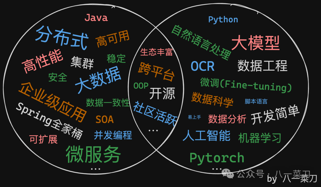 Java:使用Java生态时,针对业务系统的数据一致性,分布式、鉴权、限流等企业应用接口的特性开发,目前都有非常成熟的解决方案 Python:涉及到无状态的服务时,支撑上层应用的处理,包括数据工程、Chat模型、数据处理、微调等系统工程,那么用Python是毫无疑问的