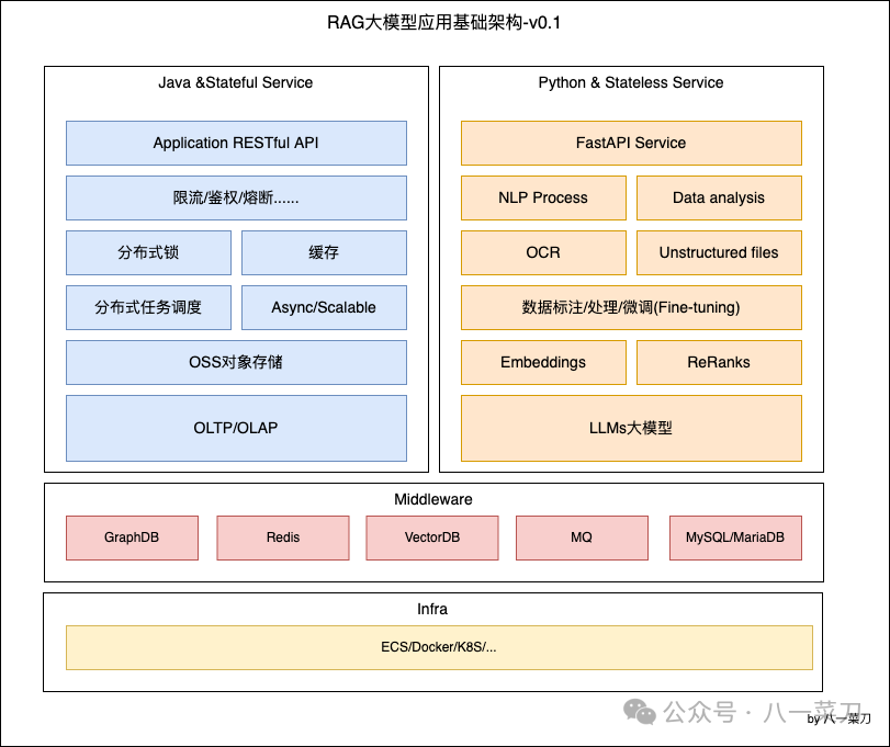 结合在开发RAG应用中涉及到的数据工程等部分逻辑,我们结合两大语言的特性,也能很轻松的勾画出一张便语言级别的架构图,涵盖了在企业开发、业务场景落地时,如何快速的适配上层应用的需求。如下图所示: