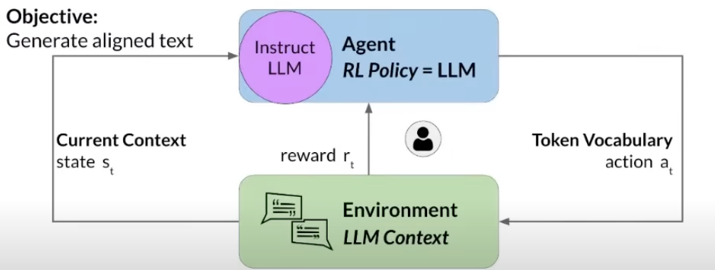 这里有Agent、Environment和大模型的Current Context,在这种情况下,策略就是知道我们预训练或者微调过的LLM模型。现在我们希望能够在给定的域中生成文本,对吗?因此,我们采取行动,LLM获取当前上下文窗口和环境上下文,并基于该动作,获得奖励。带着奖励的策略就是人类反馈的地方。