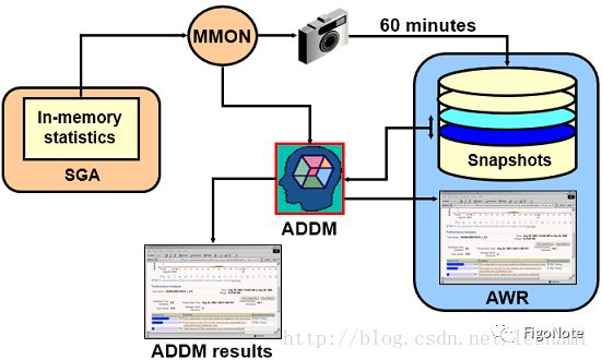 默认情况下,Oracle数据库服务器从SGA每60分钟自动收集统计信息,并以快照的形式将其存储在自动工作负载信息库(AWR)。这些快照存储在磁盘和类似于statspack快照。然而,它们含有比statspack快照更精确的信息。此外,ADDM被计划为自动运行,主动侦测每一个数据库实例。每一次拍摄快照,ADDM触发执行相应的最后两个快照周期进行分析。这种方法在数据库产生重大异常前,主动监测实例,并检测瓶颈,每个ADDM分析的结果存储在自动工作负载信息库,也可以通过OEM进行管理。