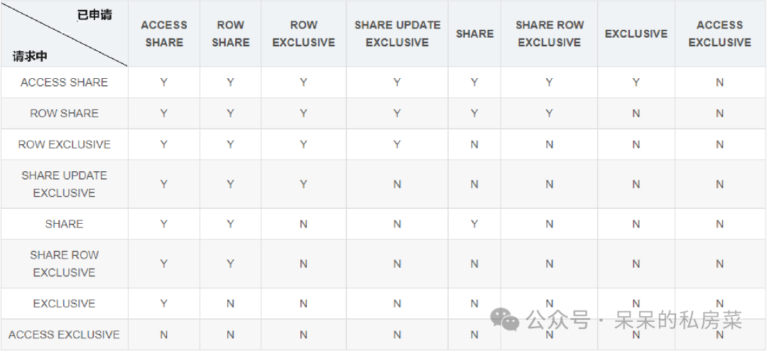 排他模式的锁(ShareRowExclusiveLock、ExclusiveLock、AccessExclusiveLock)表示事务执行期间组是其他任何类型锁作用于这张表;