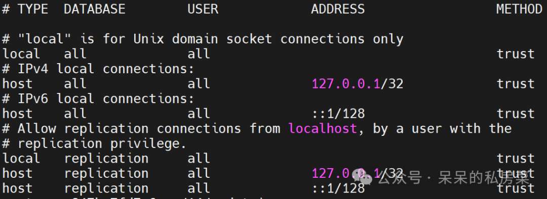 该文件用于控制访问安全性,管理客户端对于PostgreSQL服务器的访问权限。简单理解就是:允许哪个IP(或哪个网段)的哪个用户通过连接到哪个数据库,以及指定连接时使用的身份验证模式。
