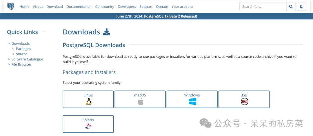 PostgreSQL支持二进制安装、RPM安装和源码安装方式。我们可以从PostgreSQL的官网下载对应操作系统的安装介质。