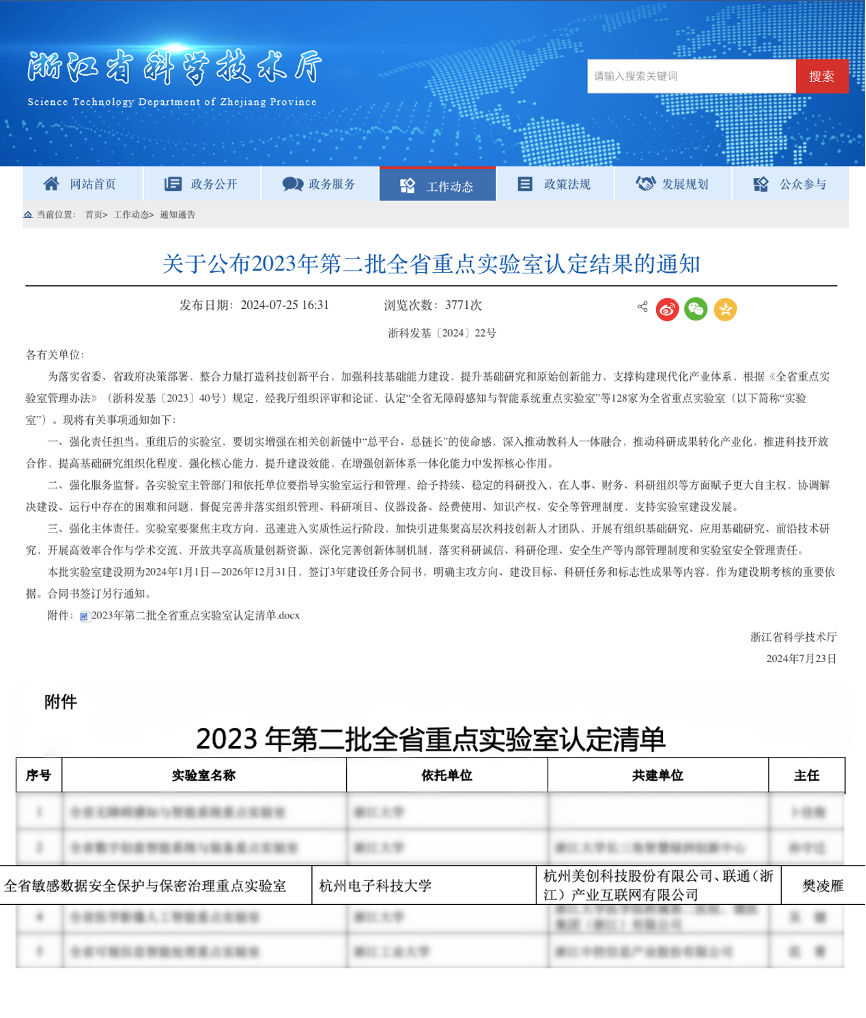 由杭州电子科技大学牵头,杭州美创科技股份有限公司、联通(浙江)产业互联网有限公司联合共建的“全省敏感数据安全保护与保密治理重点实验室” 获批认定!