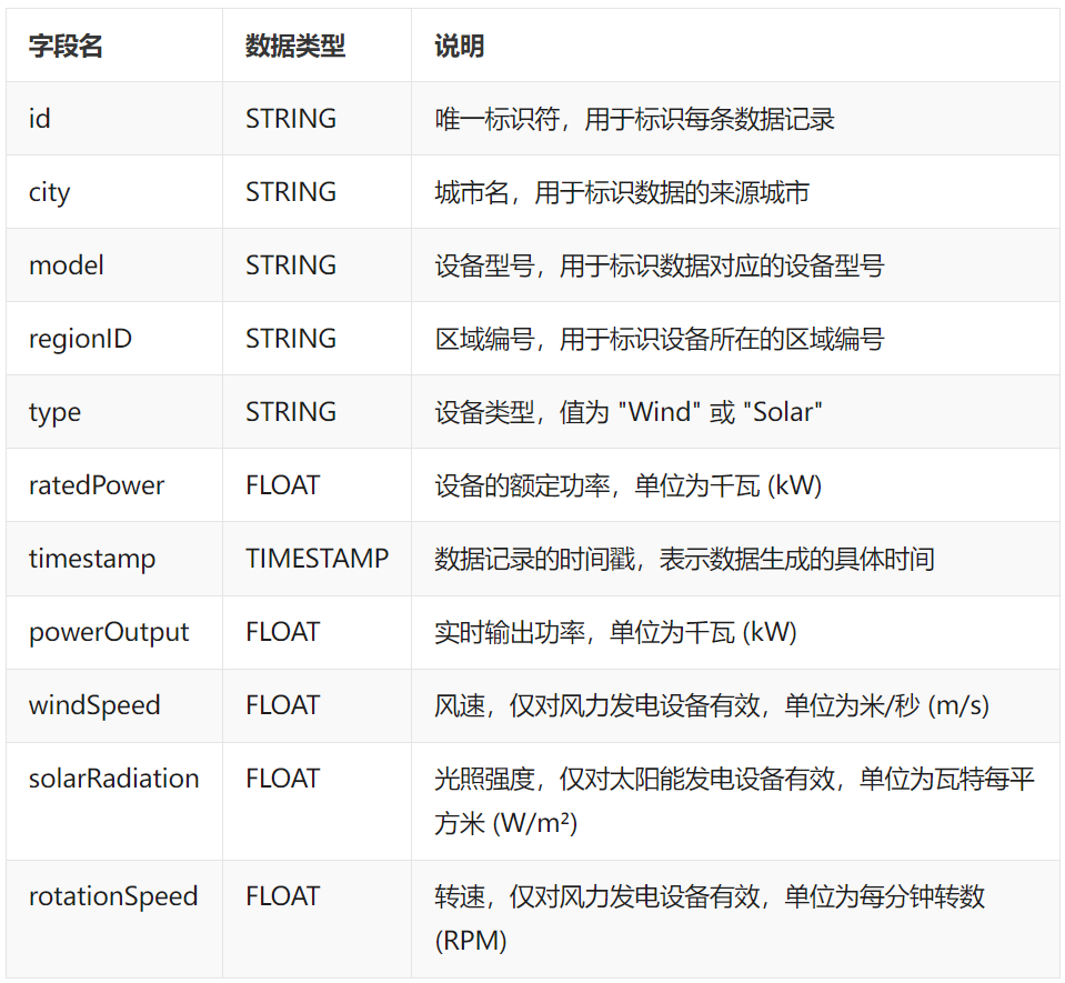 CREATE TABLE RenewableEnergyData (id STRING,city STRING,model STRING,regionID STRING,type STRING,ratedPower FLOAT,timestamp TIMESTAMP,powerOutput FLOAT,windSpeed FLOAT,solarRadiation FLOAT,rotationSpeed FLOAT);