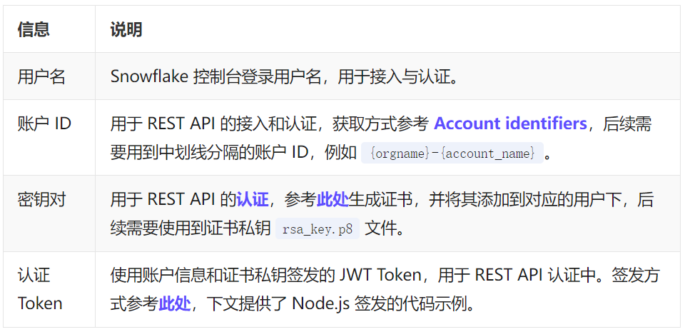 // sql-api-generate-jwt.js.const crypto = require('crypto')const fs = require('fs');var jwt = require('jsonwebtoken');// 根据实际情况修改以下值// 证书私钥文件路径var privateKeyFile = fs.readFileSync('./rsa_key.p8');// 证书密码(如果有)var mypassphrase = '';// 账户 ID,英文字符需要大写var accountID = "OXTPEXE-LCF92X4";// 注册用户名,英文字符需要大写var username = 'XXXXXX'privateKeyObject = crypto.createPrivateKey({ key: privateKeyFile, format: 'pem', passphrase: mypassphrase });var privateKey = privateKeyObject.export({ format: 'pem', type: 'pkcs8' });publicKeyObject = crypto.createPublicKey({ key: privateKey, format: 'pem' });var publicKey = publicKeyObject.export({ format: 'der', type: 'spki' });const FP = crypto.createHash('sha256').update(publicKey, 'utf8').digest('base64')var publicKeyFingerprint = 'SHA256:' + FP;var signOptions = {iat: Date.now(),iss: `${accountID}.${username}.${publicKeyFingerprint}`,sub: `${accountID}.${username}`,exp: Date.now() + 1000 * 60 * 60};var token = jwt.sign(signOptions, privateKey, { algorithm: 'RS256' });console.log("\nToken: \n\n" + token);