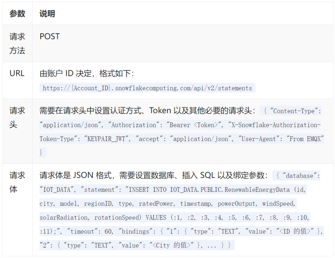 {"statement": "INSERT INTO IOT_DATA.PUBLIC.RenewableEnergyData (id, city, model, regionID, type, ratedPower, timestamp, powerOutput, windSpeed, solarRadiation, rotationSpeed)\n VALUES (:1, :2, :3, :4, :5, :6, :7, :8, :9, :10, :11);","timeout": 60,"database": "IOT_DATA","bindings": {"1": { "type": "TEXT", "value": "${payload.id}" },"2": { "type": "TEXT", "value": "${payload.city}" },"3": { "type": "TEXT", "value": "${payload.model}" },"4": { "type": "TEXT", "value": "${payload.regionID}" },"5": { "type": "TEXT", "value": "${payload.type}" },"6": { "type": "FIXED", "value": "${payload.ratedPower}" },"7": { "type": "TEXT", "value": "${payload.timestamp}" },"8": { "type": "FIXED", "value": "${payload.powerOutput}" },"9": { "type": "FIXED", "value": "${payload.windSpeed}" },"10": { "type": "FIXED", "value": "${payload.solarRadiation}" },"11": { "type": "FIXED", "value": "${payload.rotationSpeed}" }}}