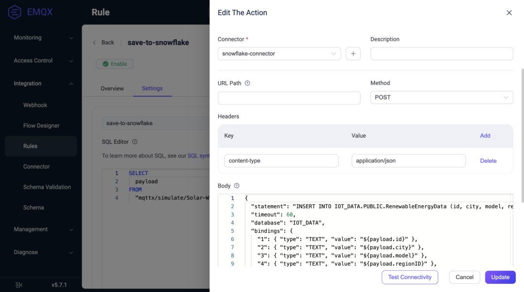 截止 EMQX Platform 企业版 v5.7.1 版本,原生的 Snowflake 数据集成还在开发中,您需要通过 EMQX Platform 的 HTTP 动作 + Snowflake REST API 进行数据写入。