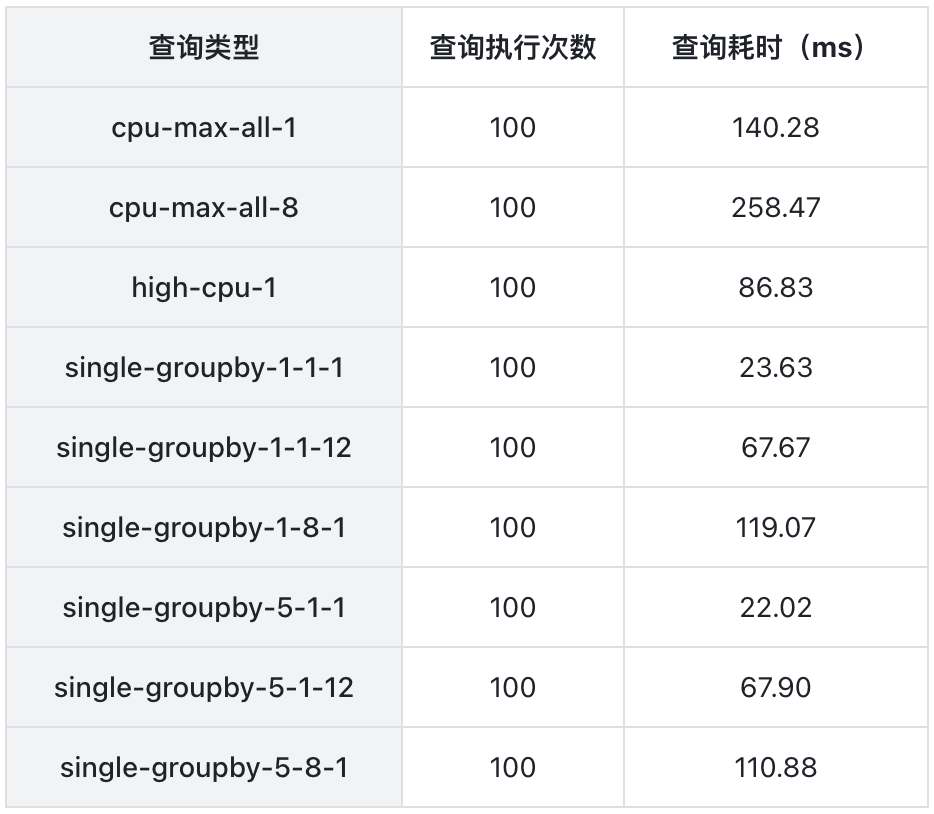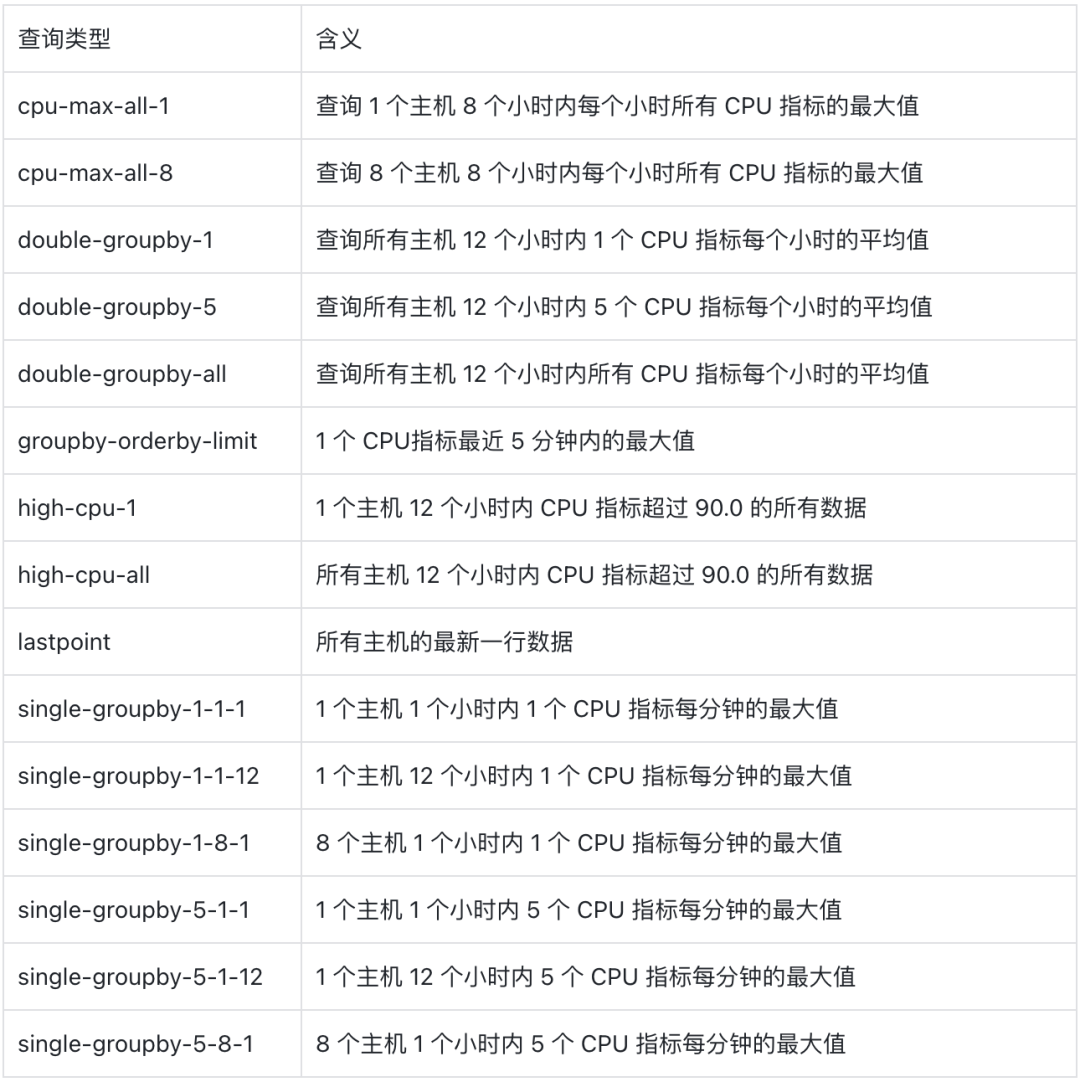 TSBS 生成的查询类型和含义如下:由于一共有 10 个 field 来记录 CPU 相关指标,因此表格里会说明具体取了几个 CPU 指标,表示查询了几个 field。