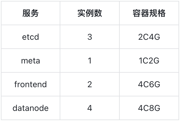系列机器,基于 EBS 存储。集群的容器规格如下: