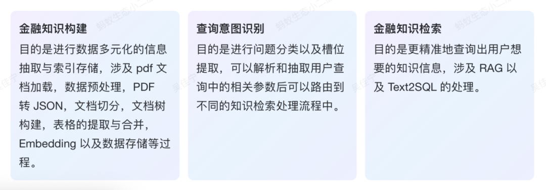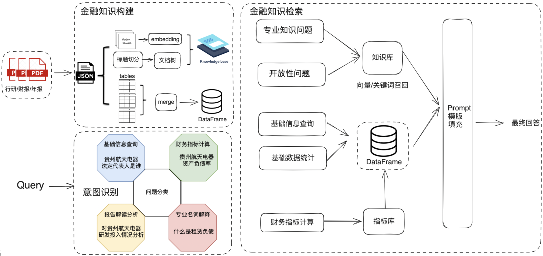 这里的架构设计主要是通过意图分类解决财报分析中可能出现的问题。针对每类意图执行单独的处理链路,每条处理链路基于不同场景精心设计。同时为了保证数据分析的正确性,我们还会通过解析和抽取用户查询中的相关参数,调用工具或执行 SQL 查询,为分析结果提供更准确的数据支持。因此整个架构围绕 3 部分进行实现,金融知识构建,查询意图识别,以及金融知识检索。