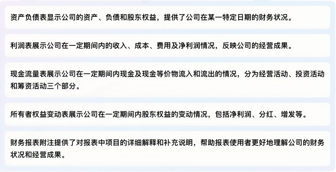 在A股上市公司发布的财务报告中,通常会包含一些重要的文本描述、财务表格和其他附注信息。每个财务报表都提供了不同方面的财务数据,用来展示公司的财务状况、经营成果和现金流情况: