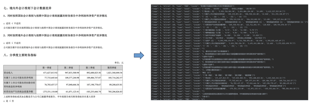 数据预处理后,我们得到了标准的结构化的json数据,基于处理后的json数据,我们将内容划分为文本和表格两大块,针对这两块数据分别进行文本信息抽取和表格抽取。