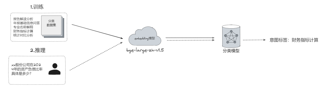 利用BGE-v1.5对用户query和意图label进行向量化,使用逻辑回归等简单的机器学习模型进行学习分类就能获得很好效果。这种方案训练时间短、准确率高,但需要根据实际业务制作query意图数据集。
