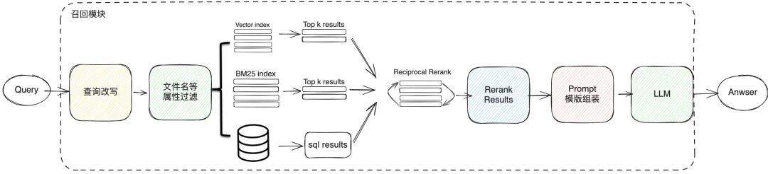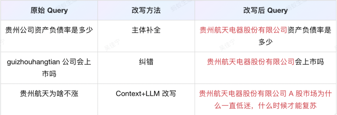 有了意图识别后,查询改写目的是将用户的query改写成语义更清晰、含义更丰富的一个可检索的Query。比如用户问贵州公司资产负债率是多少,但是实际数据库存的公司名称是贵州航天电器股份有限公司,因此需要对查询的主体进行补全改写,当然常用的改写手段还有查询纠错,使用大模型来进行改写等等。通过这一系列的处理,最终目的是把用户的Query从一个主体缺失,语义不明确、不完整、有歧义、有错的改写成一个正确的、语义表达清晰的,可召回的Query。
