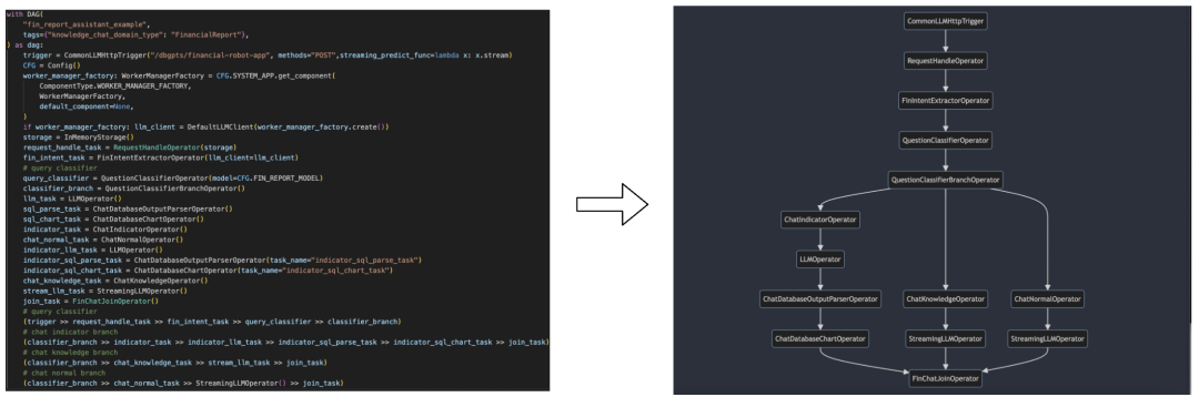 v0.5.10 版本更新 · 语雀:https://www.yuque.com/eosphoros/dbgpt-docs/lyqq2r20wyvxu69g 相关代码:https://github.com/eosphoros-ai/dbgpts Agentic Workflow Expression Language(AWEL)是一套专为大型模型应用开发而设计的智能代理工作流表达语言。它提供了强大的功能和灵活性。通过AWEL,我们可以自定义财务分析的各个环节,从数据收集、清洗、解析到最终的报告生成,形成一个完整的自动化分析链路。在财务分析系统中,不同任务可由不同的AWEL workflow协同完成。例如,一个workflow负责财务报告的知识加工,另一个workflow负责投资评级。通过AWEL编排,让不同的agent可以协同工作,实现更复杂和全面的财务分析任务。