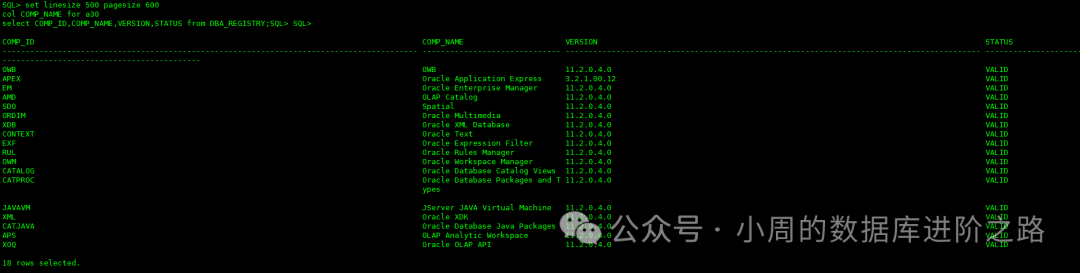 SQL> select COMP_ID,COMP_NAME,VERSION,STATUS from DBA_REGISTRY;