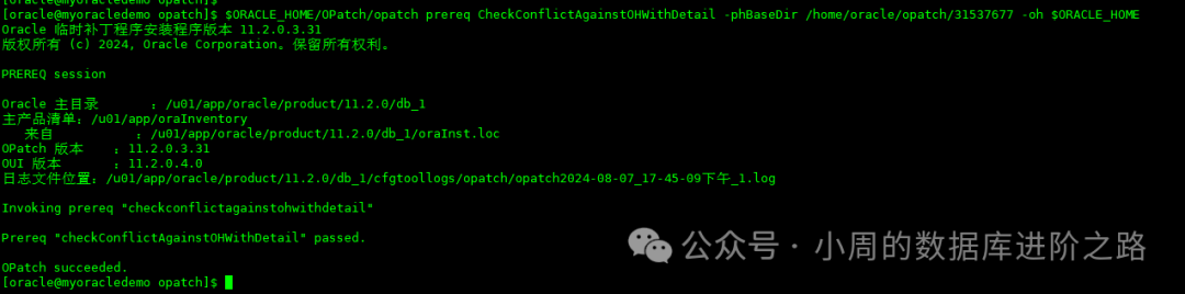 [oracle@myoracledemo opatch]$ $ORACLE_HOME/OPatch/opatch prereq CheckConflictAgainstOHWithDetail -phBaseDir /home/oracle/opatch/31537677 -oh $ORACLE_HOME