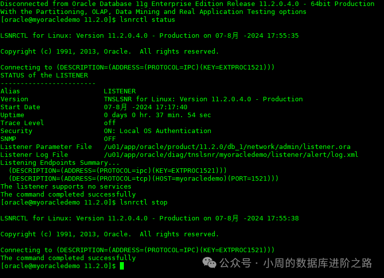 [oracle@myoracledemo 11.2.0]$ lsnrctl stop