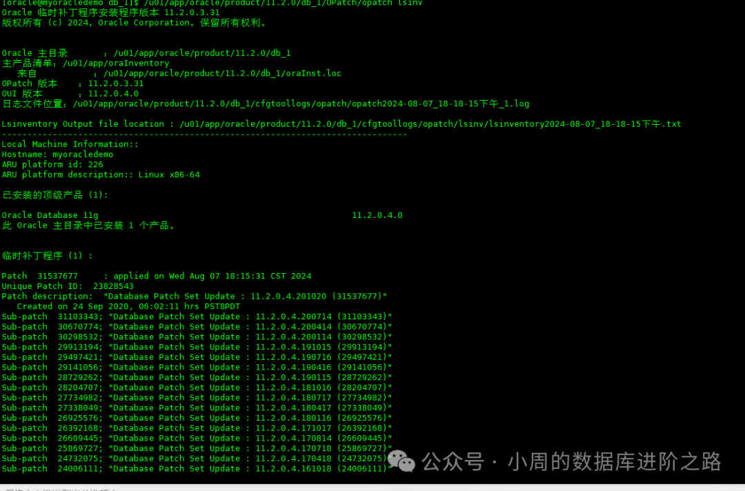 [oracle@myoracledemo db_1]$ /u01/app/oracle/product/11.2.0/db_1/OPatch/opatch lsinv