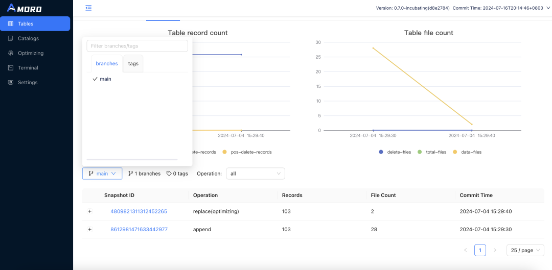 Tag 和 Branch 是 Iceberg 等新型数据湖表格式带来的新特性,Tag 可以帮助用户记录需要长期保留的快照,并在需要时读取里面的内容,Branch 允许在表上添加一些待验证的更新,并在经过验证后合入主分支中。0.7.0版本中 Amoro 支持了对 Iceberg 和 Paimon 表的Tag 及 Branch 的管理。