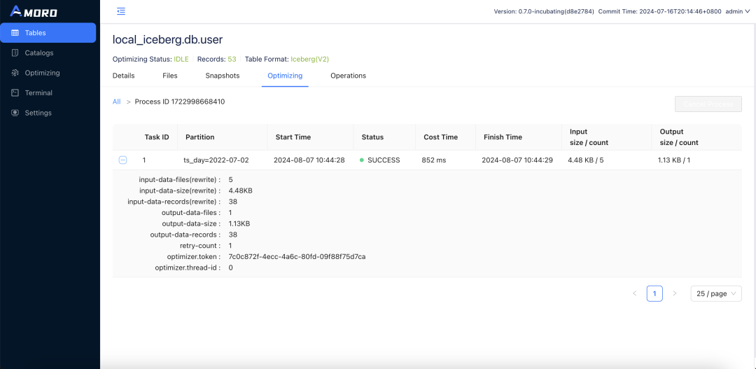 0.7.0 版本中添加了对数据优化任务更详细信息的展示,我们不仅能看到数据优化任务的各项 metric 信息,更能进一步查看到所有子任务的详细信息。该特性旨在帮助用户更容易排查一些数据优化任务的性能问题。