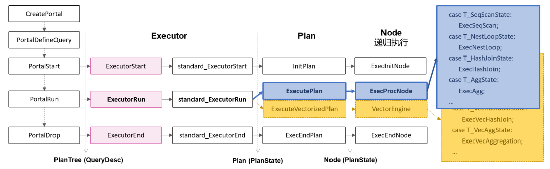 执行器的执行:行引擎和向量化引擎入口独立开,从计划树根节点开始,递归遍历到叶节点获取一个tuple/batch,经过逐层节点算子的处理,返回一个结果tuple/batch,直到再无tuple/batch。