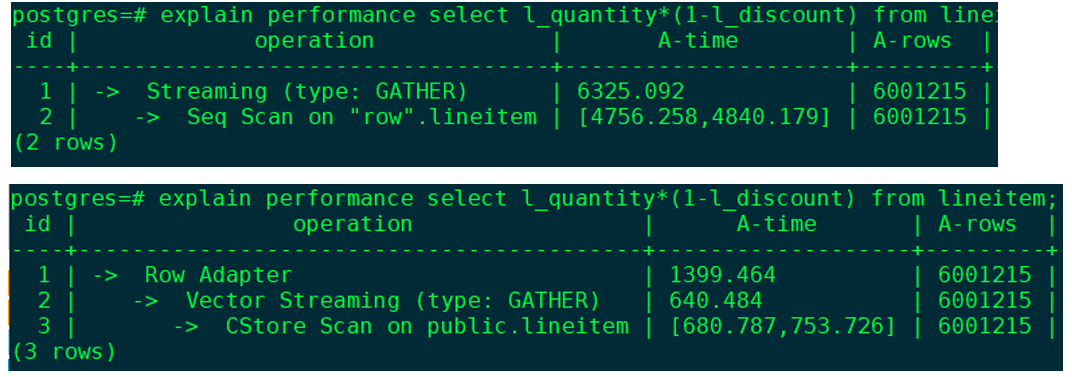 对比行列存引擎对同一表达式x*(1-y)计算的性能,可以看到列存引擎的Cstore Scan算子相比行存引擎的Seq Scan算子,耗时减少了85%。