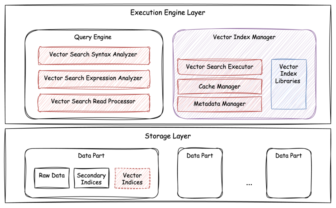 目前比较流行的向量索引算法有 HNSW、Faiss IVF 等,这类基于向量索引的向量检索负载,通常具有构建时间长、资源消耗大等特点,且需要考虑如何高效管理索引构建任务所需资源;如何支持内存计算;如何与过滤语句结合以及资源消耗等一系列问题。ByteHouse 源自 ClickHouse,但后者存在向量索引重复读取,相似度计算冗余等问题,对于延迟要求低、并发需求高的向量检索场景可用性较弱。基于上述分析,ByteHouse 在向量检索能力上进行了全面创新,团队基于 vector-centric 的思路,重新构建了高效的向量检索执行链路,结合索引缓存、存储层过滤等机制,使 ByteHouse 性能实现进一步突破。