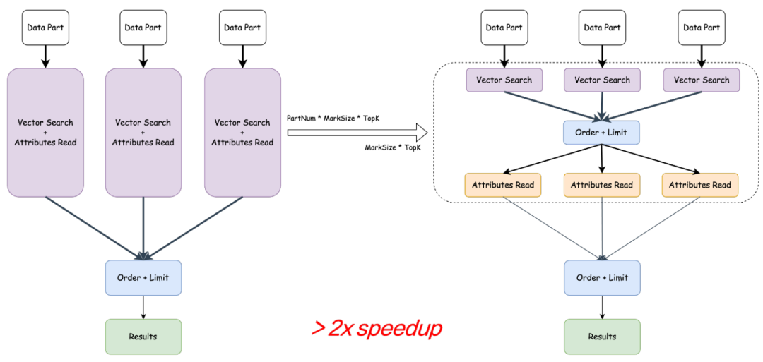在典型的 OLAP 场景中,数据进入后,会生成多个 Data Part,按批聚合。按照算子执行,对每个 Part 进行 Vector Search 和 Attributes Read,然后对每个 Part 做 TopK。这在投影列较多的情况下,产生很大的资源消耗。● 首先,对每个 Part 进行 Vector Search,相当于将一个算子拆分成三个算子,先做Vector Search。● 然后,对 Vector Search 的结果进行全局排序,此时不读取标量信息列。● 最后,在全局排序的结果上,执行 Read Task,得到最终结果。通常而言,数据是分批写入的,每一批都会有一个Part,Part 一般大于 100。那么,在优化后的实际场景测试中,延迟基本可以做到两倍以上的速度提升。