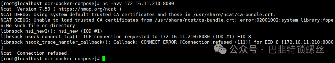 [root@localhost ncport]# sh nc-ports.sh172.16.11.210 80:fail172.16.11.210 6379:fail172.16.11.210 18000:fail172.16.11.211 3306:fail172.16.11.212 10001:fail172.16.11.209 8099:fail172.16.11.210 8088:ok
