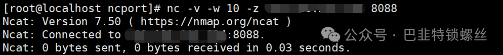 [root@localhost ncport]# cat nc-ports.sh#/bin/bash# 获取执行当前脚本的路径DIR=$(cd $(dirname $0) && pwd )cat $DIR/ip-ports.txt | while read line;donc -w 10 -z $line > dev/null 2>&1if [ $? -eq 0 ];thenecho $line:okelseecho $line:failfidone