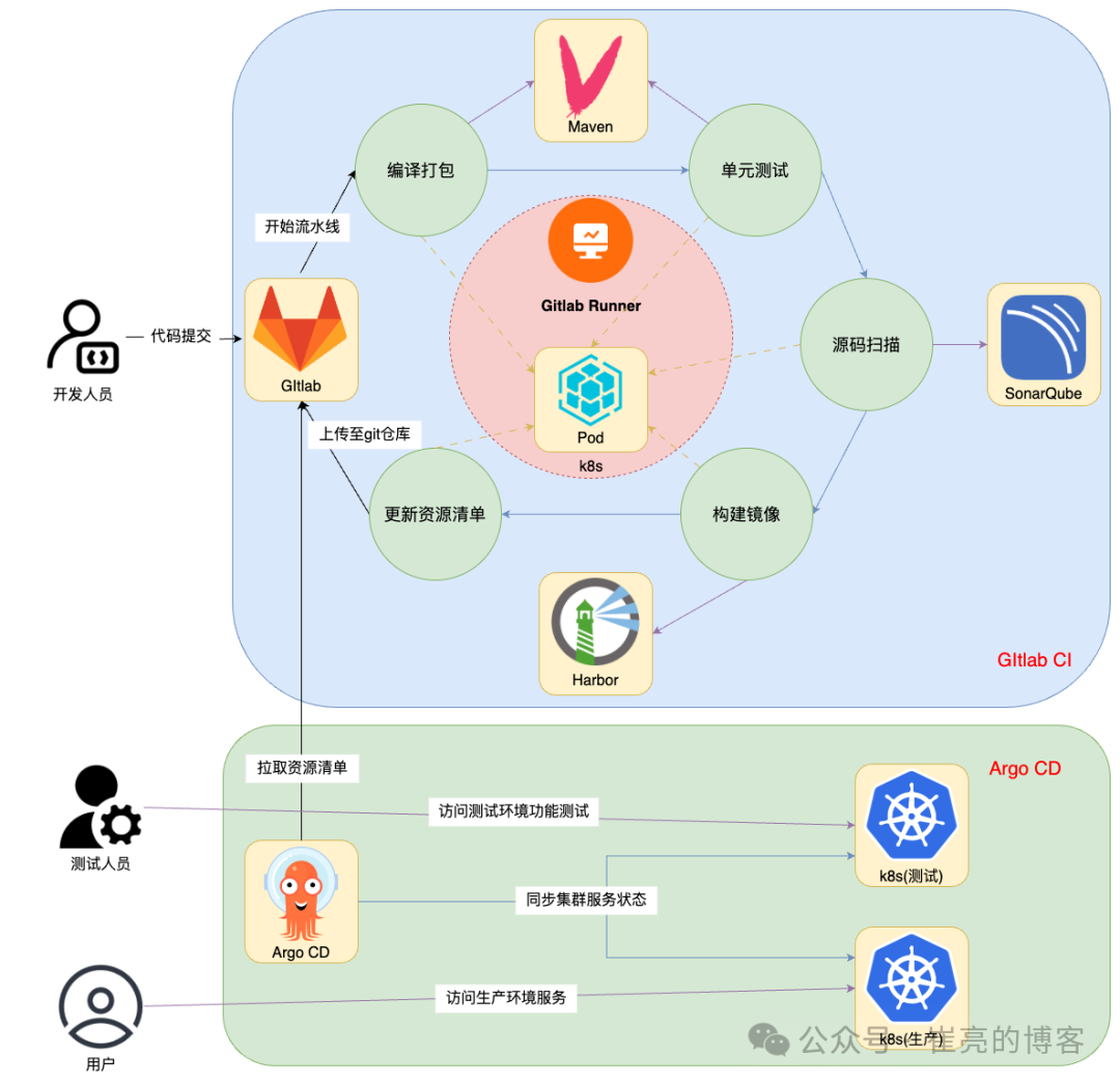 本项目构建了一个基于GitOps理念的完整CI/CD管道,旨在实现软件开发与运维的高度自动化和一致性。通过GitLab、GitLab Runner(部署于Kubernetes)、Maven、Java、SonarQube、Harbor以及Argo CD等工具的紧密协作,实现代码提交后自动进行编译打包、单元测试、代码扫描、构建镜像、更新资源清单以及滚动更新、蓝绿部署、金丝雀发布、多集群发布功能。